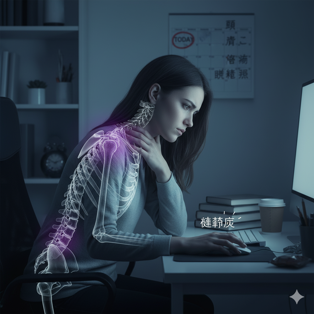 座っている時間が長いと、猫背やストレートネックになりやすく、特定の筋肉にばかり負担がかかることで、以下のような不調につながります。 ⚡ 首・肩の慢性的なコリや痛み
