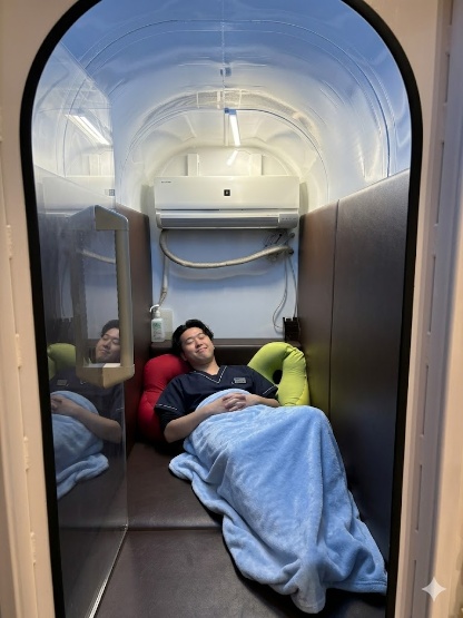 A: 60分程度、横になってリラックスしていただくだけです。スマートフォンを持ち込んだり、読書をしたりすることも可能ですが、最もおすすめなのは「睡眠」をとることです。カプセル内での1時間の睡眠は、通常の数時間の熟睡に匹敵すると言われています。